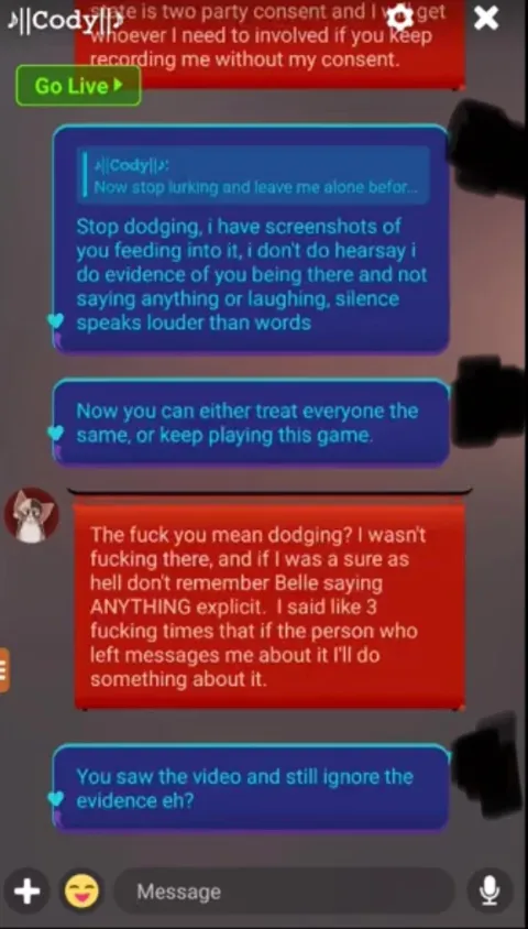 Belle tried to falsely strike the evidence videos of them having sexual conversations around minors on video