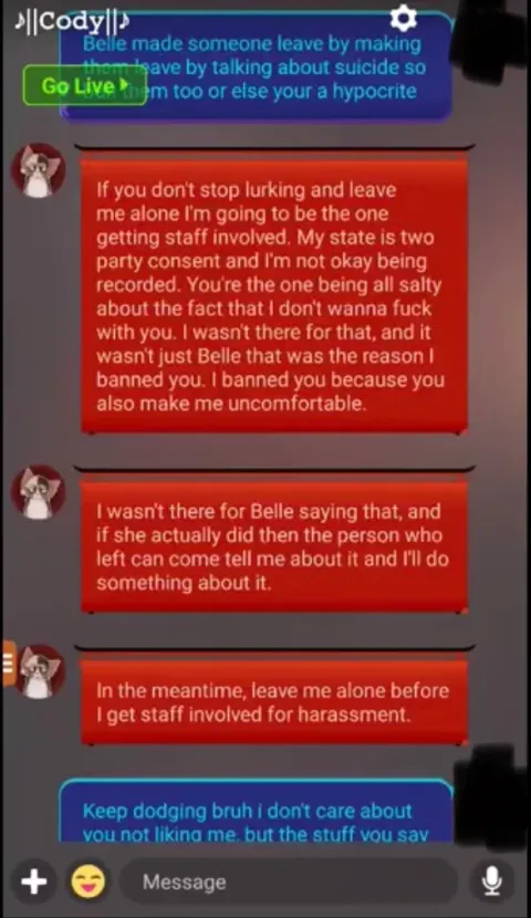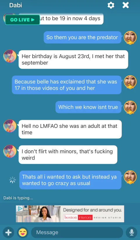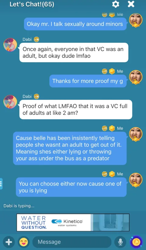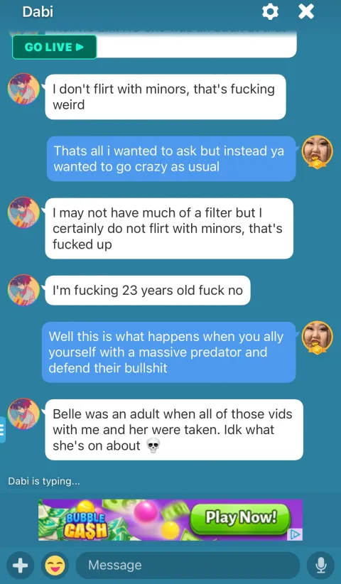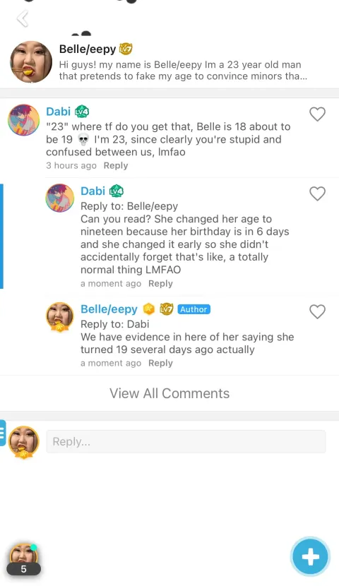 Belle faked their age numerous times to avoid taking responsibility for talking sexually around and with minors