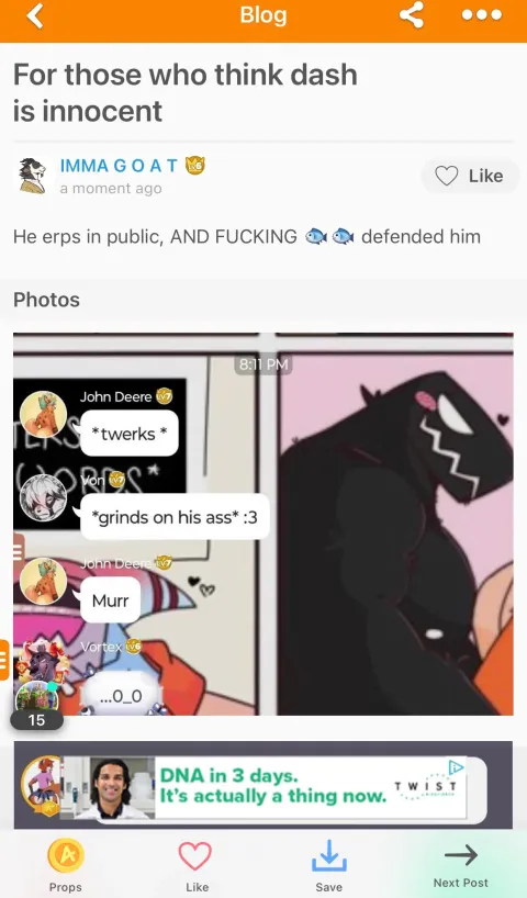 Dash had been caught all over 18+ furry amino communities posting Nsfw content