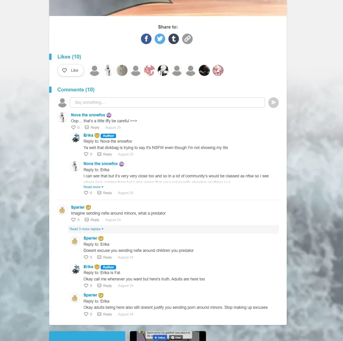Erika posted NSFW artwork publically to the furries-amino community filled with minors
