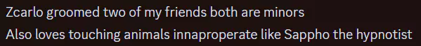 Amino that contains Zoophilia - Animal Abuse - Pedophilia - Child Predatory - Art Theft - Corrupt Leadership - Doxing - DDosing - Grooming - Stalking