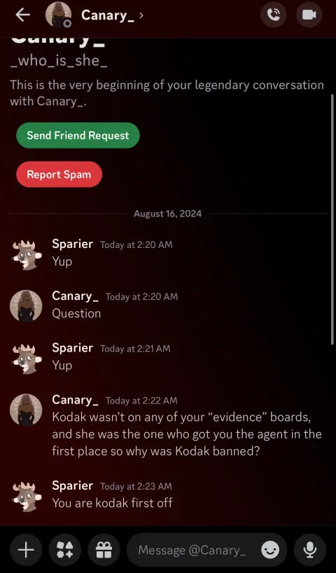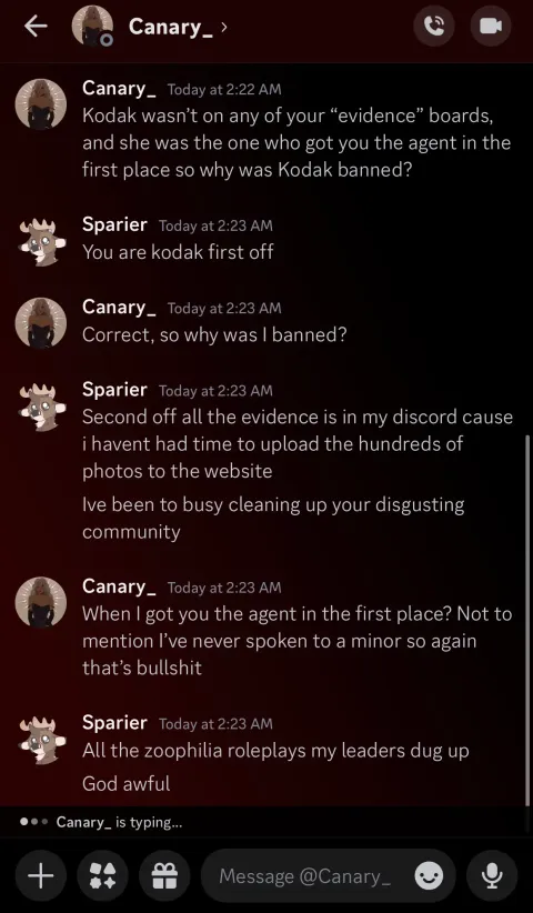 Leader Kodak tried to manipulate Sparier by using an alternate account after her permanent ban from Furry568