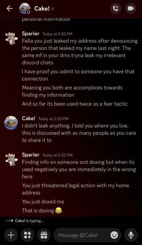 Rainy threatened Sparier in the discord with a dox of his name and address