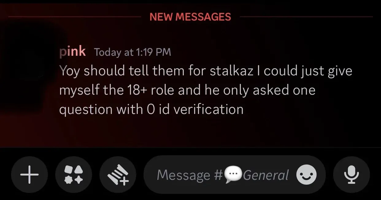 Stalkaz tried to manipulate the situation by adding an "age verification system" and blaming others f0r the NSFW content in his discord.
