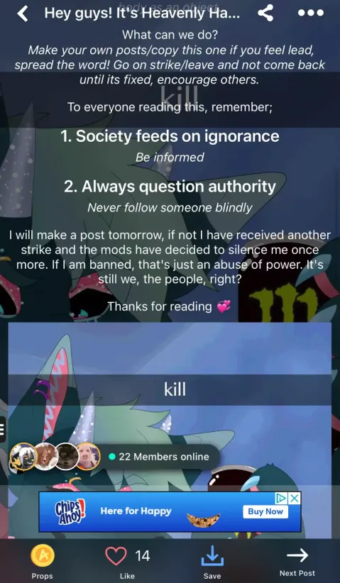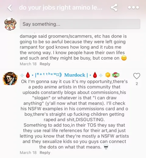 Amino that contains Zoophilia - Animal Abuse - Pedophilia - Child Predatory - Art Theft - Corrupt Leadership - Doxing - DDosing - Grooming - Stalking
