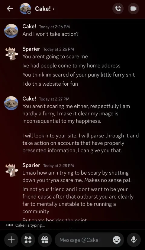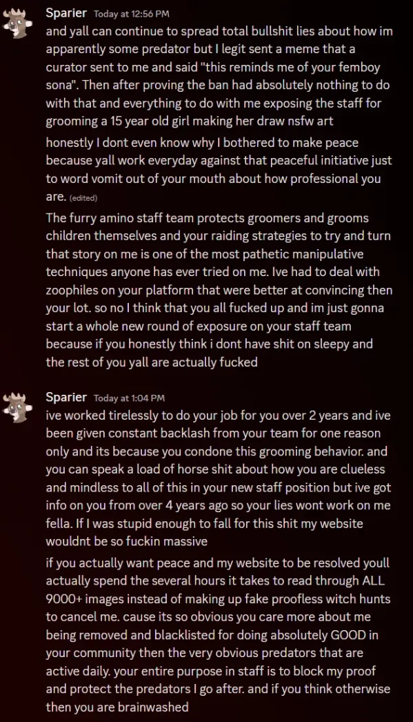 Sparier brought this up to furry-amino curator SleepyVinca who commented that the furry-amino leaders were finding it all “entertaining”