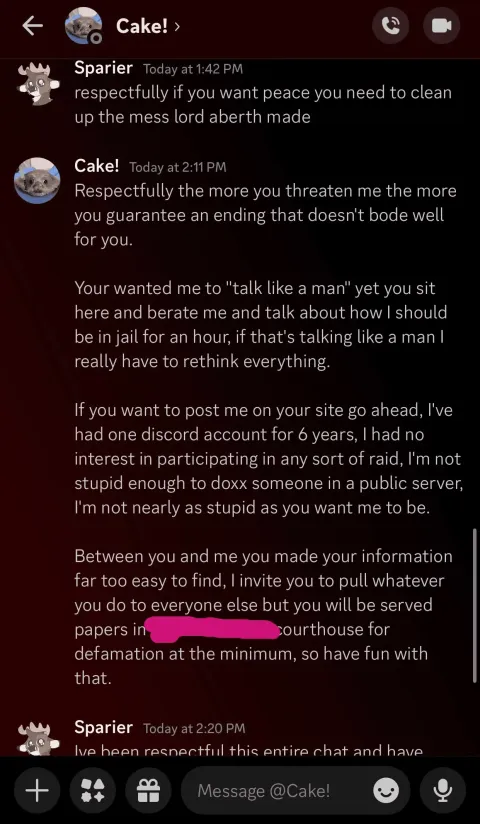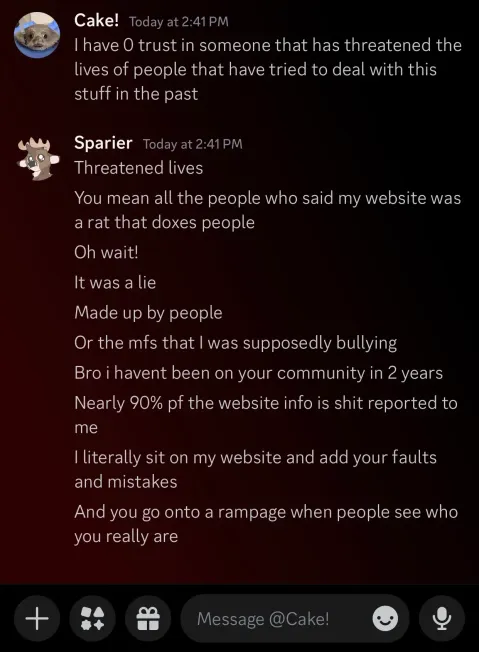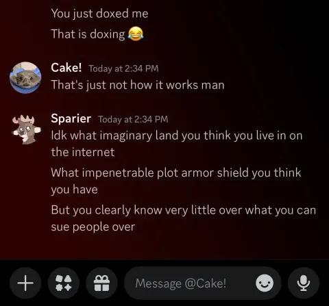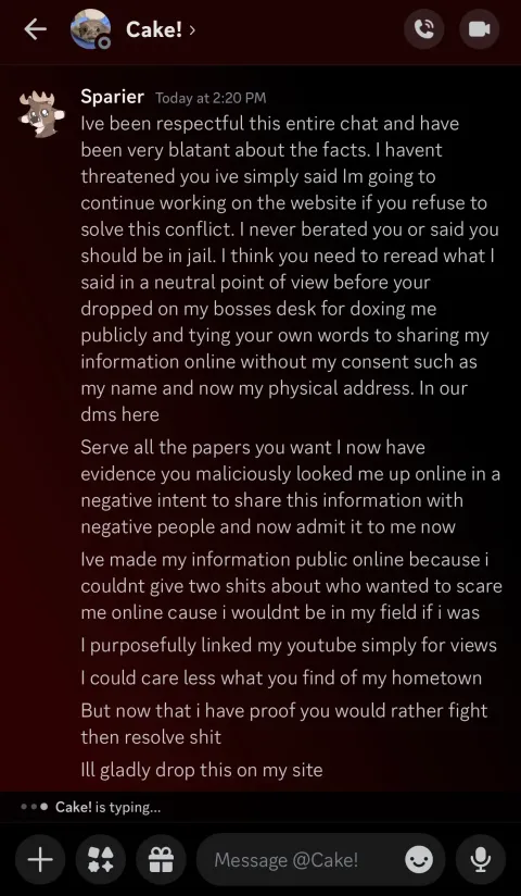 Rainy threatened Sparier in the discord with a dox of his name and address
