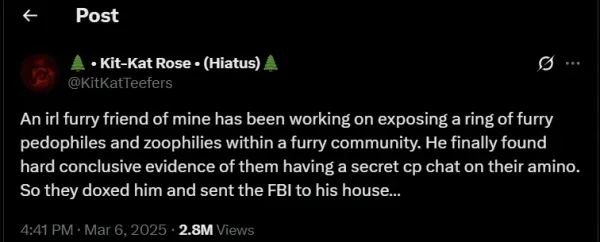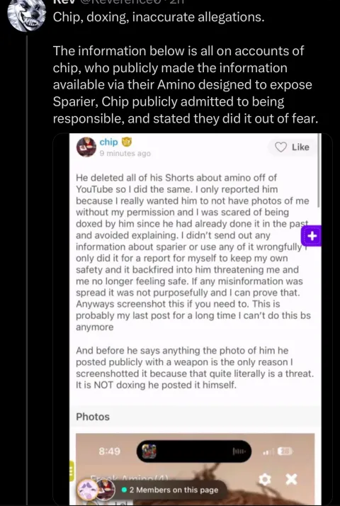 A furry-amino user reported on Twitter/x about the furry-amino leadership helping multiple predators dox and swat Sparier