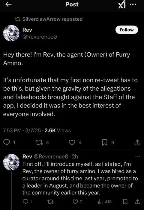 A Curator from furry-amino reported Leader Rev to Sparier with evidence of Rainy's connection to Rev