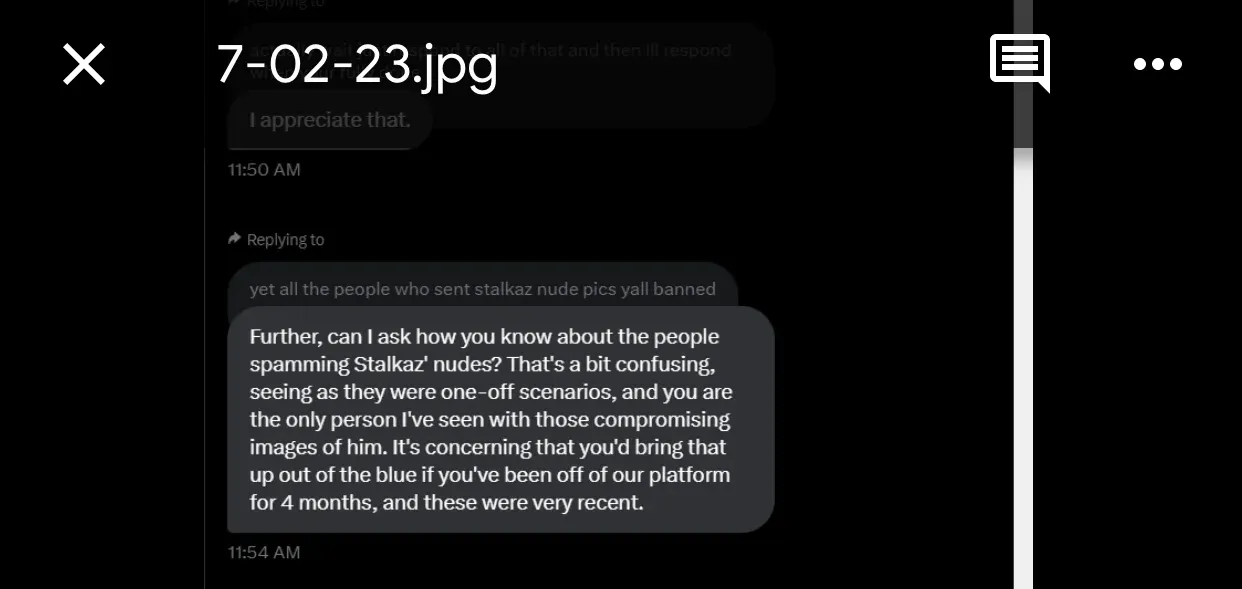 Agent SilverClawArrow Finally banned STalkaz for "off platform evidence" to protect their own skin after defending Stalkaz since 2022.