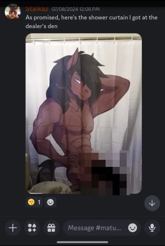 Stalkaz Shared a photo of his furry pornography shower curtains to his discord for all ages to see.