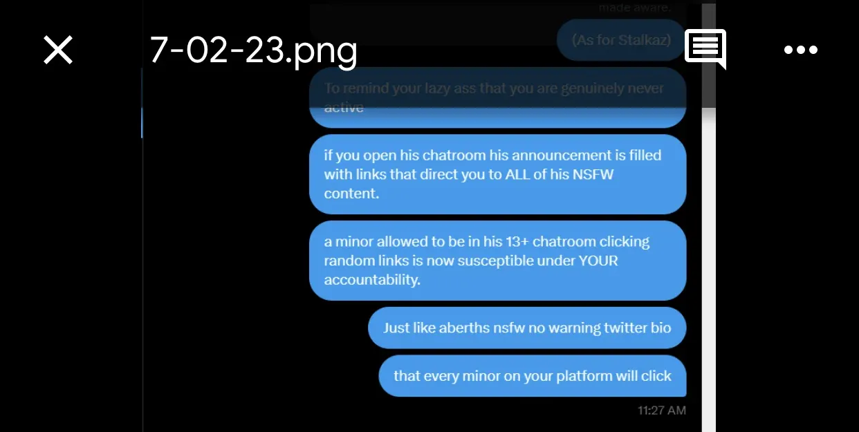 EVIDENCE 12: "STALKAZ ENCOURAGED POSTING CHILD NSFW"