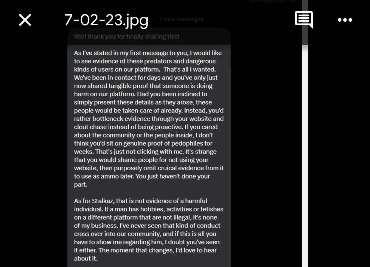 Agent SilverClawArrow refused to review the website or the evidence against Stalkaz immediately after it was sent to protect him.